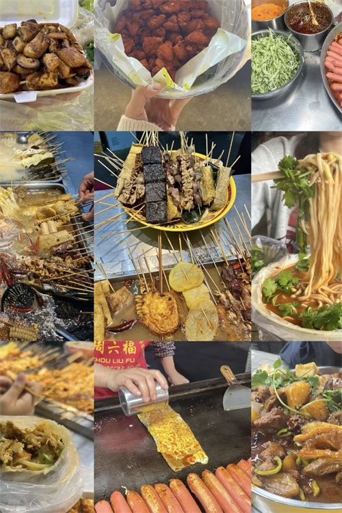 申庄美食街,大学生认证的“全国美食博览会”。上百家摊位横跨台湾翅包饭、东北锅包肉、韩式铁板烧三界,一站式吃遍全国风味。这里有学生们强推的“三大战神”,辣到流泪还想啃的张记光明路羊蹄、现场捶打糯米的木桶饭团、拉丝不断的芝士火鸡烤冷面以及河南本地连汤肉片。不仅如此,周三或周五还有大学生乐队驻唱,吃着烤串听着歌别有一番风味。
