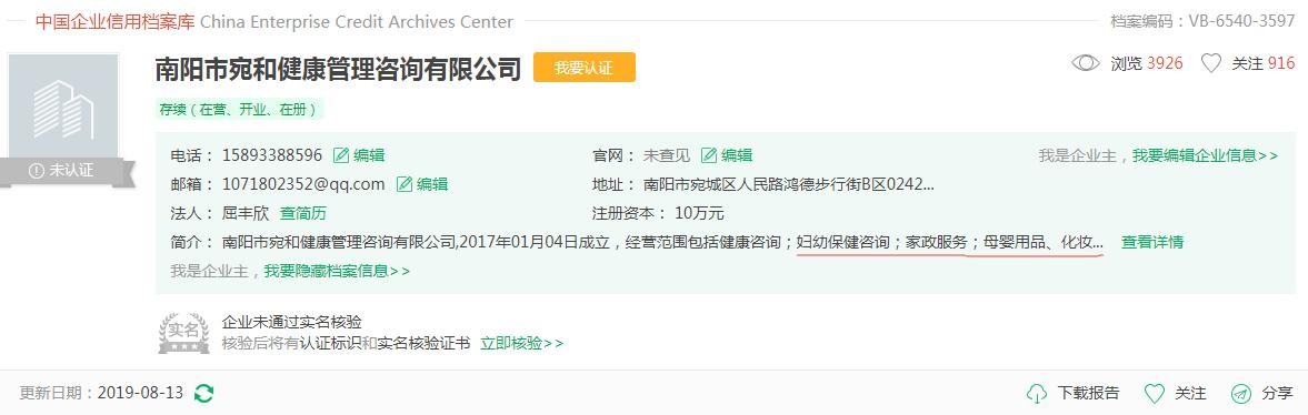 南都记者查询发现,南阳宛和整形医院注册的登记公司名为南阳市宛和健康管理咨询有限公司,经营范围包括健康咨询、妇幼保健咨询、家政服务、母婴用品、化妆品、美容仪器、玩具和百货销售。