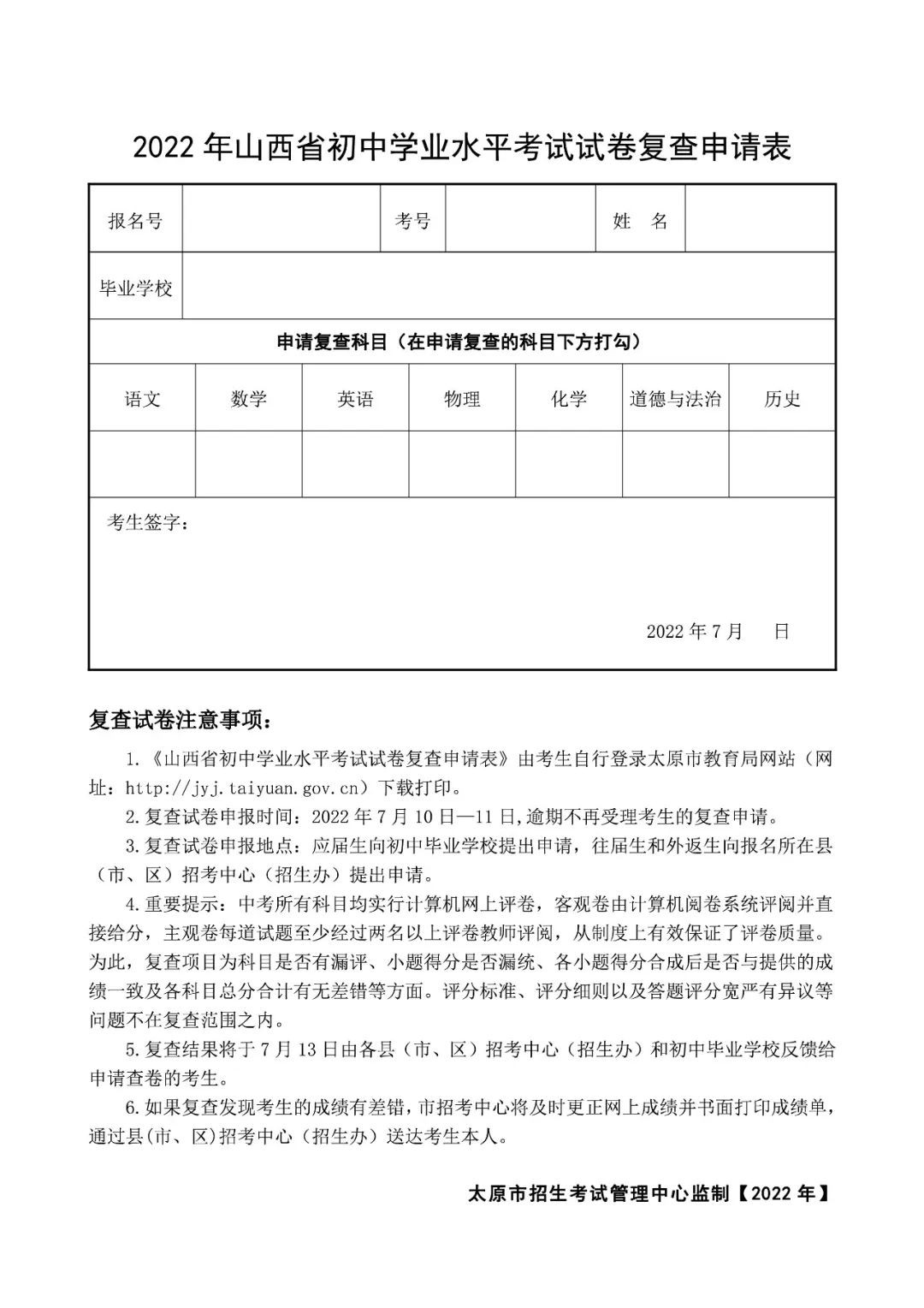 考生可于7月10日至11日申请查卷,逾期不再受理。复查内容包含主观卷是否有漏评、合分错误等,客观题及评分宽严问题不在复查范围之内。考生须在“太原市教育局网站”(网址:http://jyj.taiyuan.gov.cn)“中考招生”栏目下载填写《山西省初中学业水平考试试卷复查申请表》并于7月11日18时前提交报名单位,7月13日报名单位向考生反馈查卷结果。