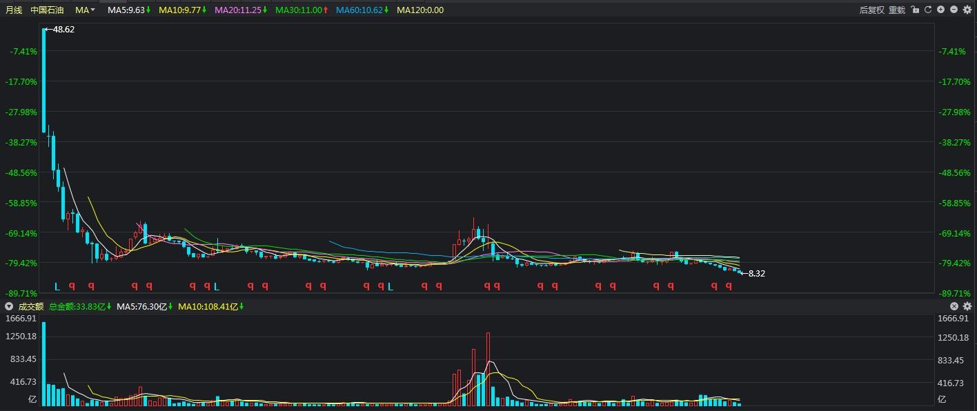 而此时,中国石油价格仅有5.56元,即便是将分红因素考虑进去,按照后复权来看,也只有8.32元,亏损高达82.88%。很多专家在中石油上市的时候说,买入中石油就是给子孙买了一棵摇钱树,现在孩子们慢慢长大了,摇钱树快摇没了。