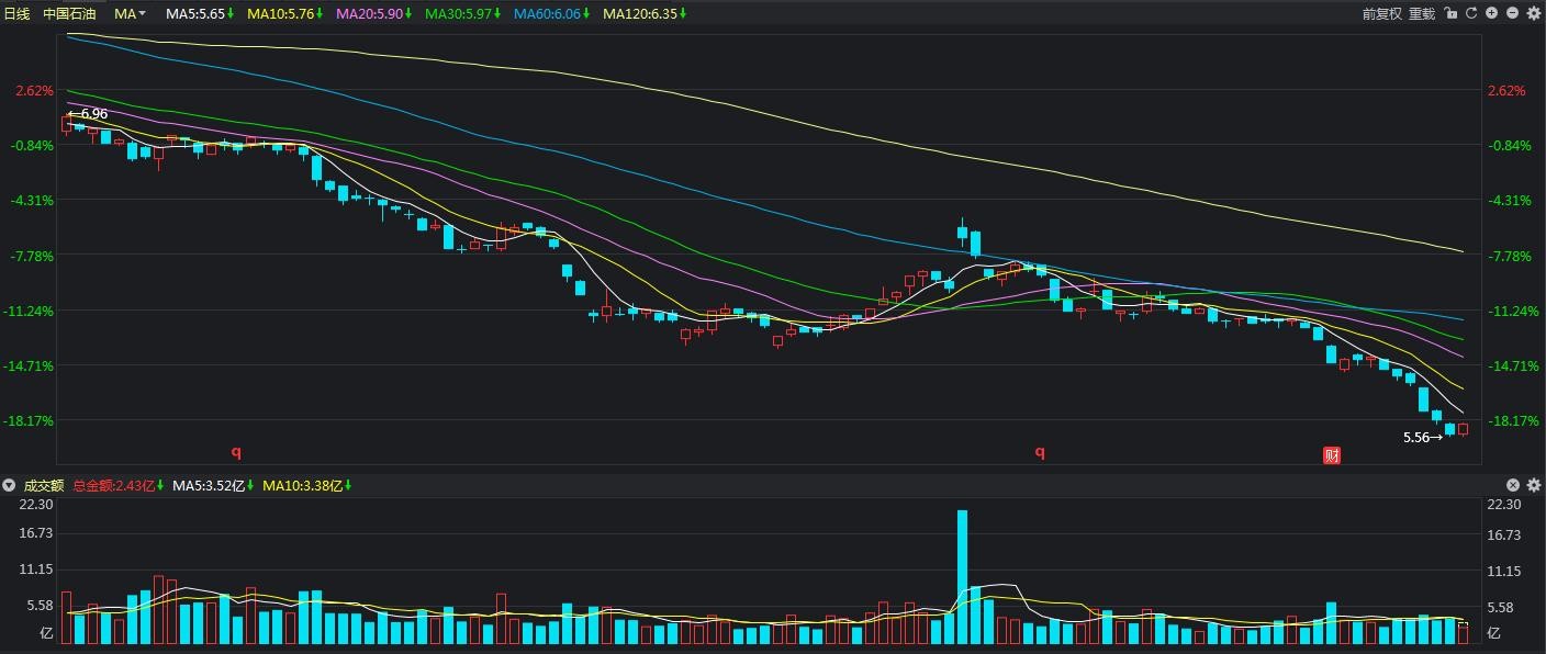 今天,中国石油股价继续下跌,盘中最低跌至5.56元,创下上市以来的新低。由于中国石油权重巨大,也影响最近A股持续下跌。