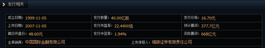 中石油2007年11月5日在上交所主板上市,当时正好处于大牛市中,中国石油上市首日价格就涨到了48.62元。