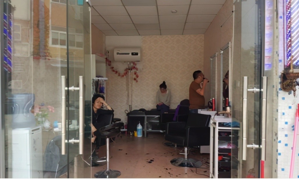 这家理发店位于深圳市龙岗区坪地镇的一个城中村当中,理发店的北边是一条繁忙的机动车道,西边有酒吧,南边是几栋老旧的农民房,可以看出罗福兴的理发店位置是非常不好的,所以平时人流量也非常少,在平时的工作当中,他大多时候都是闲着的,只能泡茶、玩手机。