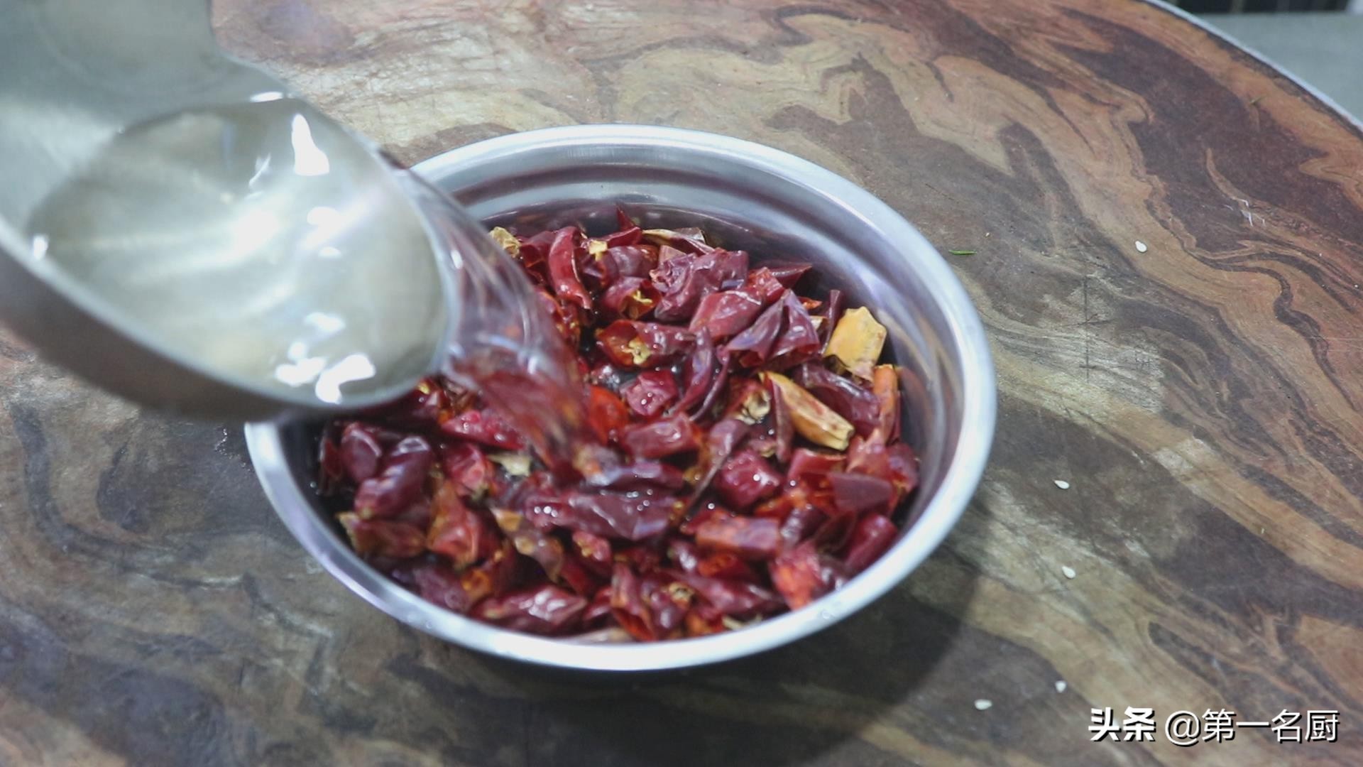 然后加入适量清水浸泡,这样可以避免花椒和红干椒,在炒制的时候糊锅。