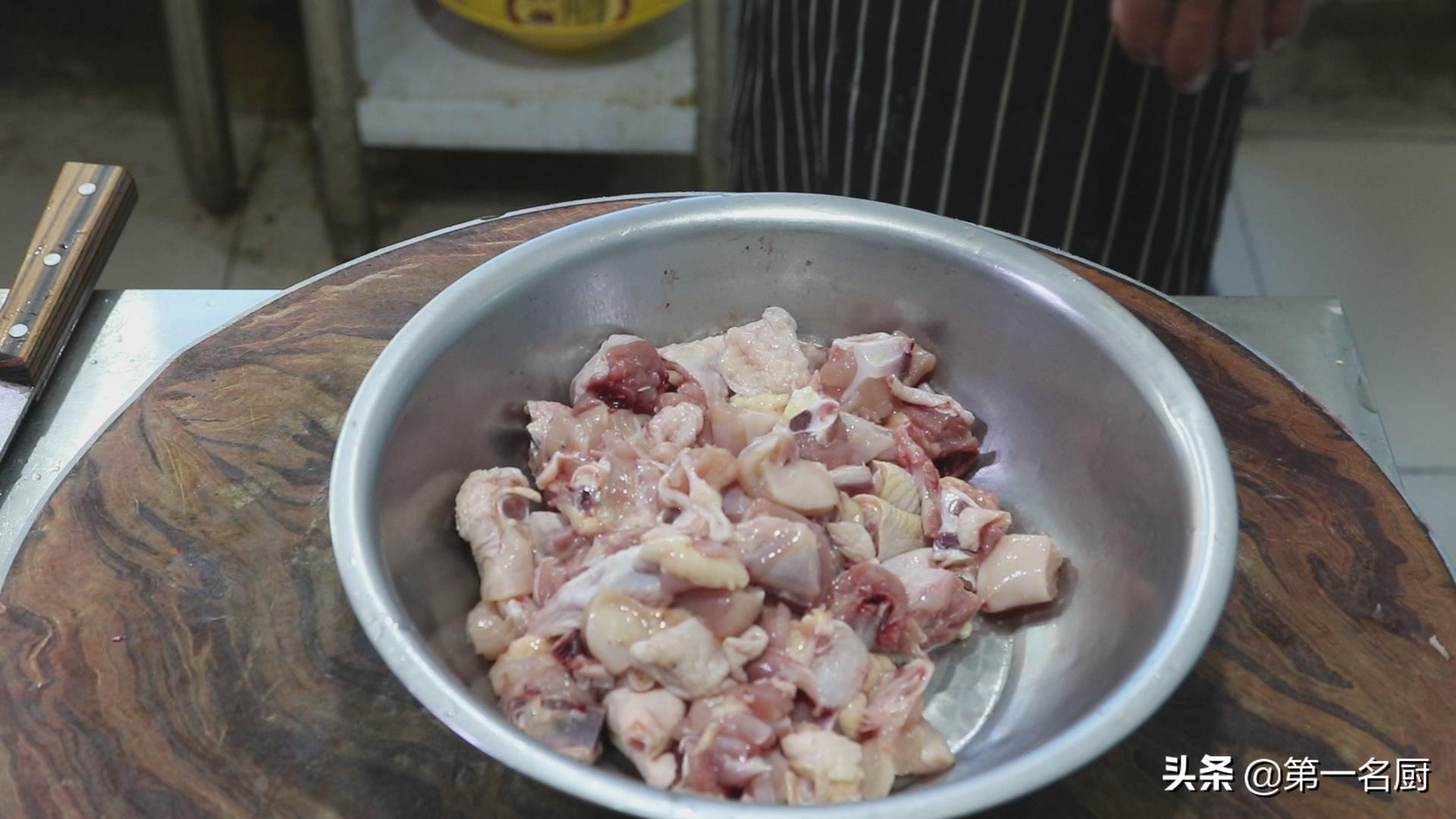 先斩掉鸡翅,剁成小段,再把剩余的鸡肉,都剁成大小均等的鸡块,放入盆中备用。