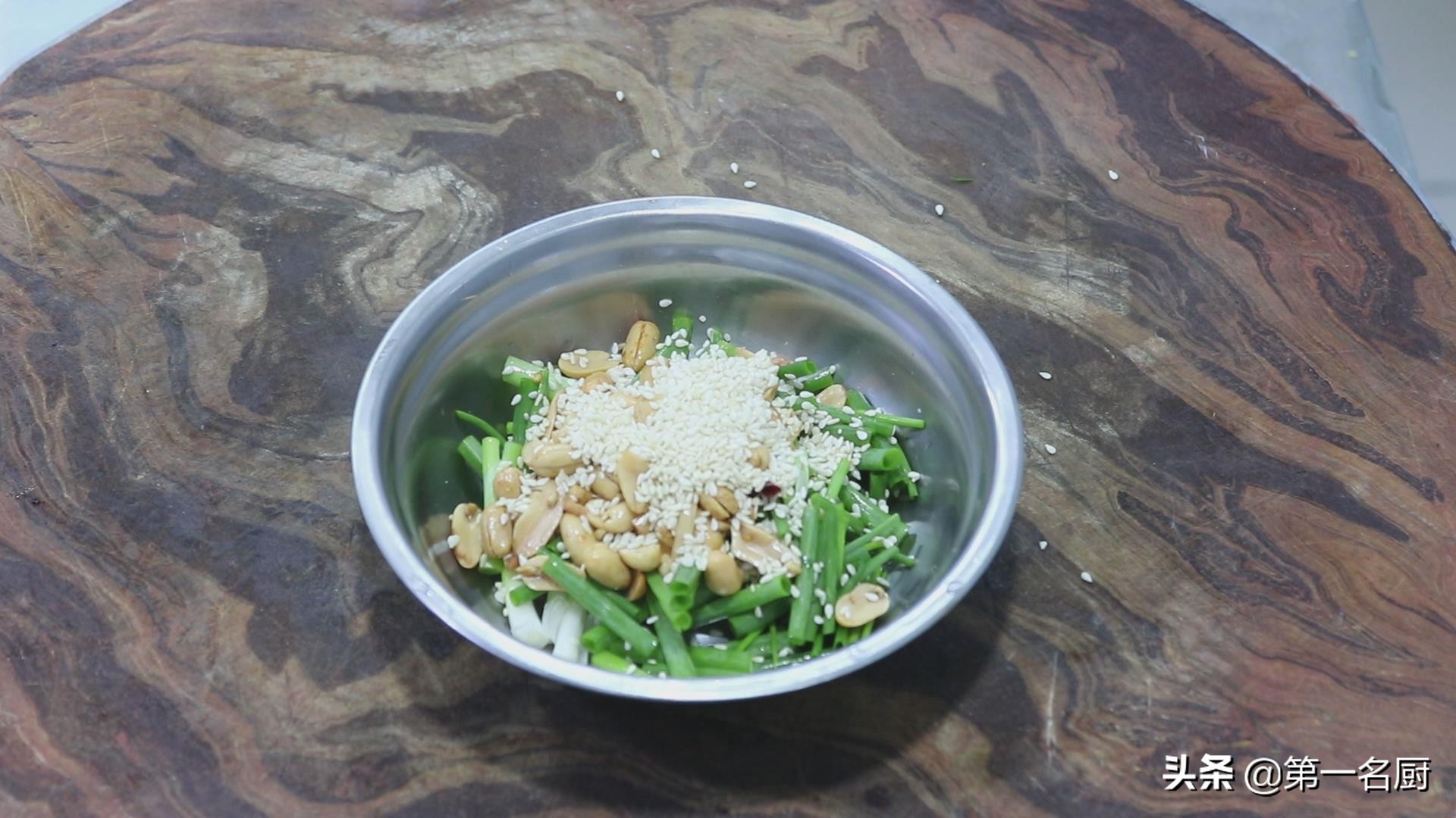 小葱几个切成寸段,放入小盆中,再抓入一小把油炸花生米,和适量的白芝麻备用。