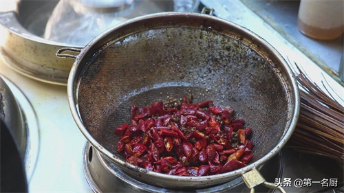 准备一个小盆,放入花椒一小把,红干椒适量,辣椒也可以根据的口味来添加。