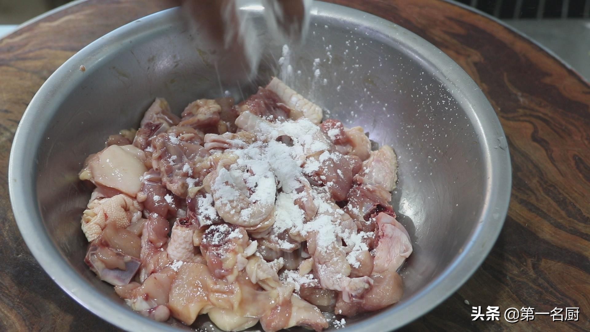 10分钟过后,在鸡肉里面加入适量的玉米淀粉,用手反复抓匀,使鸡肉均匀的裹上淀粉,这样可以更好的锁住鸡肉里面的水分,保留鸡肉的营养不流失。