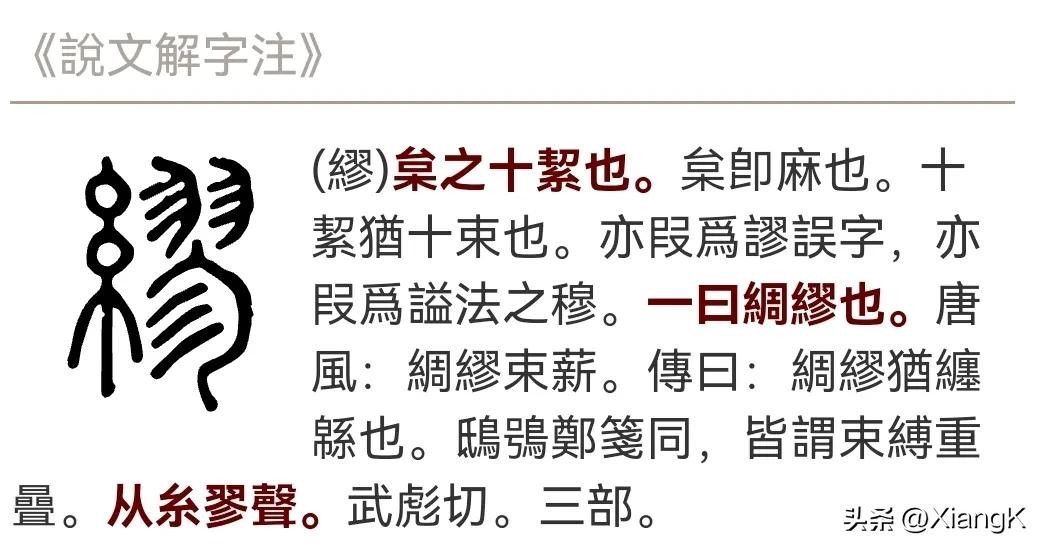 (1)、在《说文解字》中:枲之十絜也。一曰綢繆。从糸翏聲。武彪切