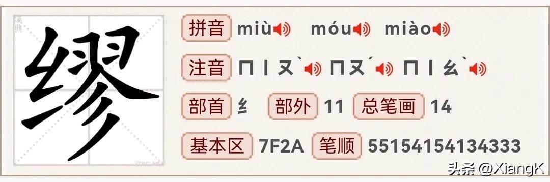缪是三音字,读音为“miù”、“móu ”、“miào”;同音字为“谬、谋、妙”、部首为纟、总笔画14、左右结构。