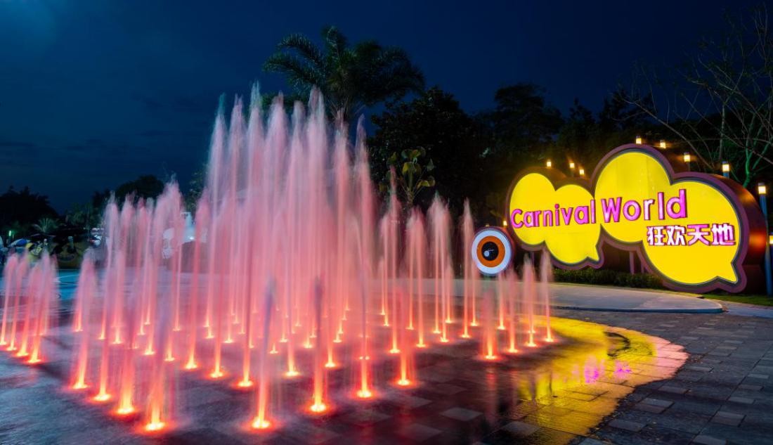 夜晚降临,园区内渲染上彩色灯光,配上浪漫欢快的音乐,以及潺潺的清凉细水,营造出全息的夜晚梦幻临境感,简直是童话城堡!