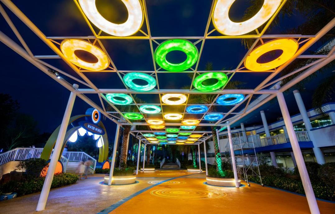 穿过水世界入口的时光隧道,缤纷多彩的园区景象赫然呈现眼前——飓风湾里的造浪池正波涛翻涌,水上舞台里张牙舞爪的章鱼触须造型奇趣搞怪、抓人眼球!清爽明丽的视觉上给人逼真的"海洋"体验感,让人恨不得马上扎进池子里体验这份凉爽与刺激!