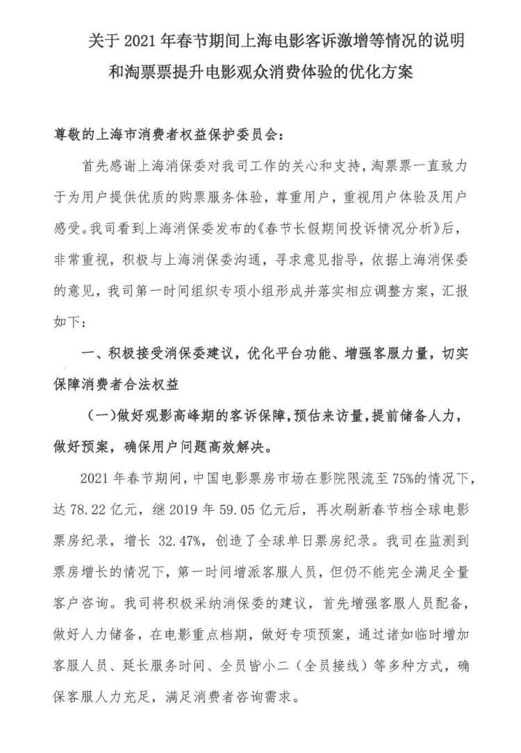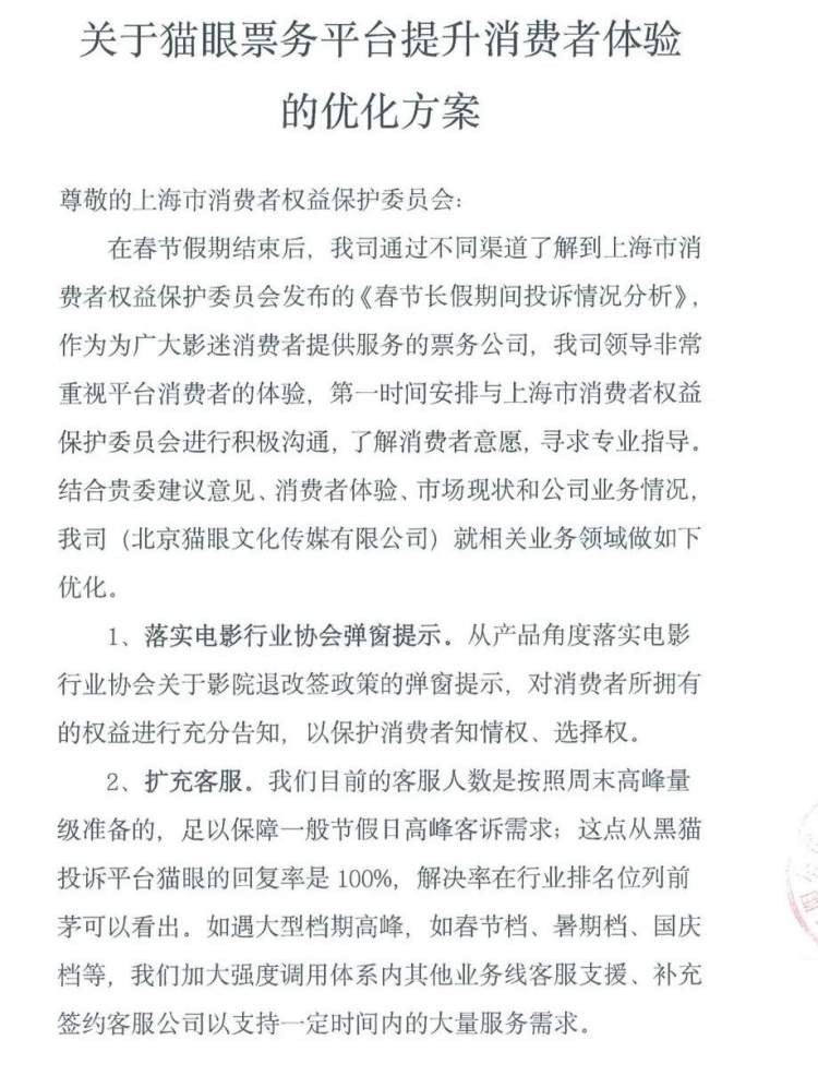 针对上海市消保委提出的相关建议,北京猫眼文化传媒公司与上海淘票票影视文化有限公司积极表态,已于2月26日向上海市消保委提交书面优化方案,切实回应消费者关切。