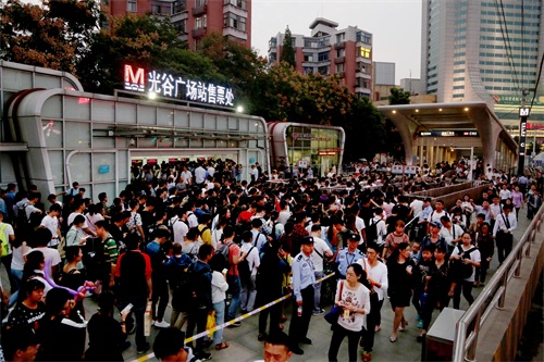 开通7年间,光谷广场地铁站火爆的消息,常常占据各大媒体的头条位置。一张摄于2017年的老照片显示,学生们在光谷广场站C出入口前排着长龙,密密麻麻转了好几道弯。