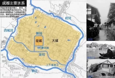 金河完成之初并不叫金河,成都的先人们习惯上是称之为“襟河”的。这是因其自成都外西的西郊河引水入城,斜贯城中,最终出城汇于流经外东的府河,就与南河在地理上形成衣襟模样,故得“襟河”名。金河得名,则是在明代初修建了皇城以后,才开始流传开的。