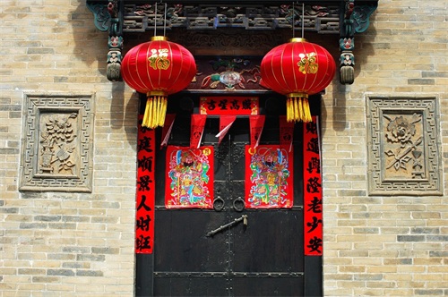 在大门贴春联,记得要贴单数,单数象征吉祥。还有,家门口不要单贴“春”字,可以贴福、招财进宝等。