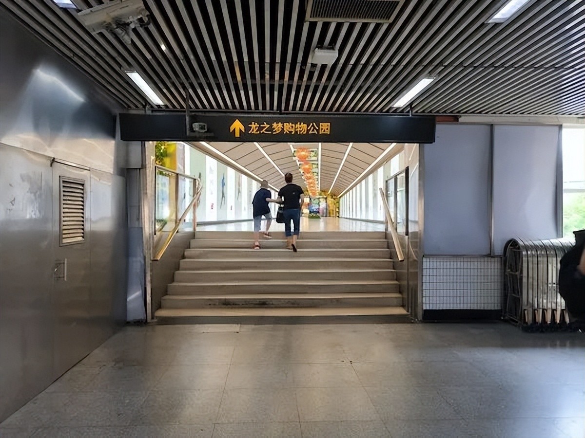 3、4号线换乘2号线也非常麻烦。如果携带大件行李、行动不便的乘客想要坐无障碍电梯,只能出站去龙之梦购物中心,然而通往龙之梦的通道要走一段八级台阶。进入龙之梦后,离地铁站最近的无障碍电梯却不停靠B2层,必须坐商场中央的另一部无障碍电梯去B2层,整个过程前后绕了将近半小时。