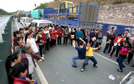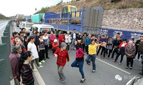 事情是这样的:去年 4月22日,云南一段高速公路发生交通事故,造成堵车。被堵路上的大爷大妈纷纷下车解闷,其中不少大妈竟然在车缝中跳起了广场舞。