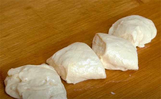 3.面团饧好之后不用揉,直接整理成长条,下4个剂子。