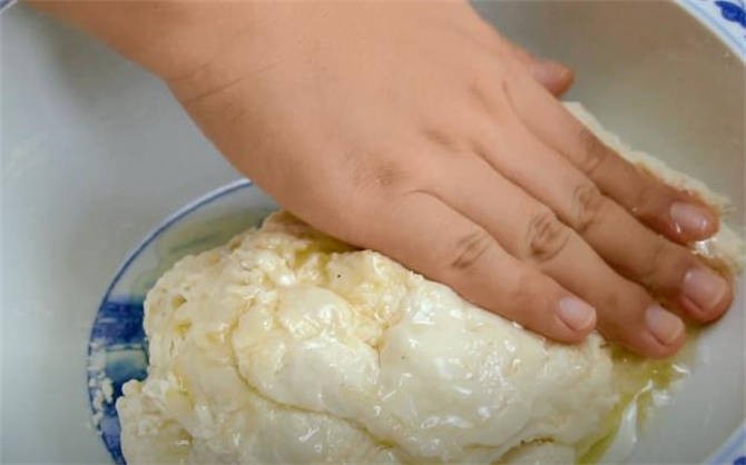 1.准备普通面粉300g,盐3g增加面粉的筋性,温水200毫升一边倒一边搅拌,一直搅拌成这样的粘稠的面团,表面涂抹一层油,密封饧面半个小时。