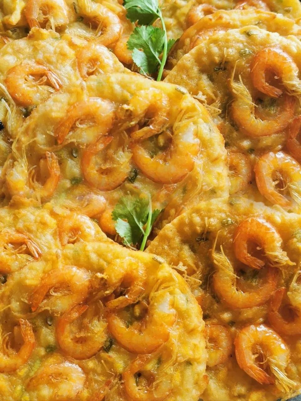 - 将面糊倒入模具或勺子中,加入几只鲜虾。