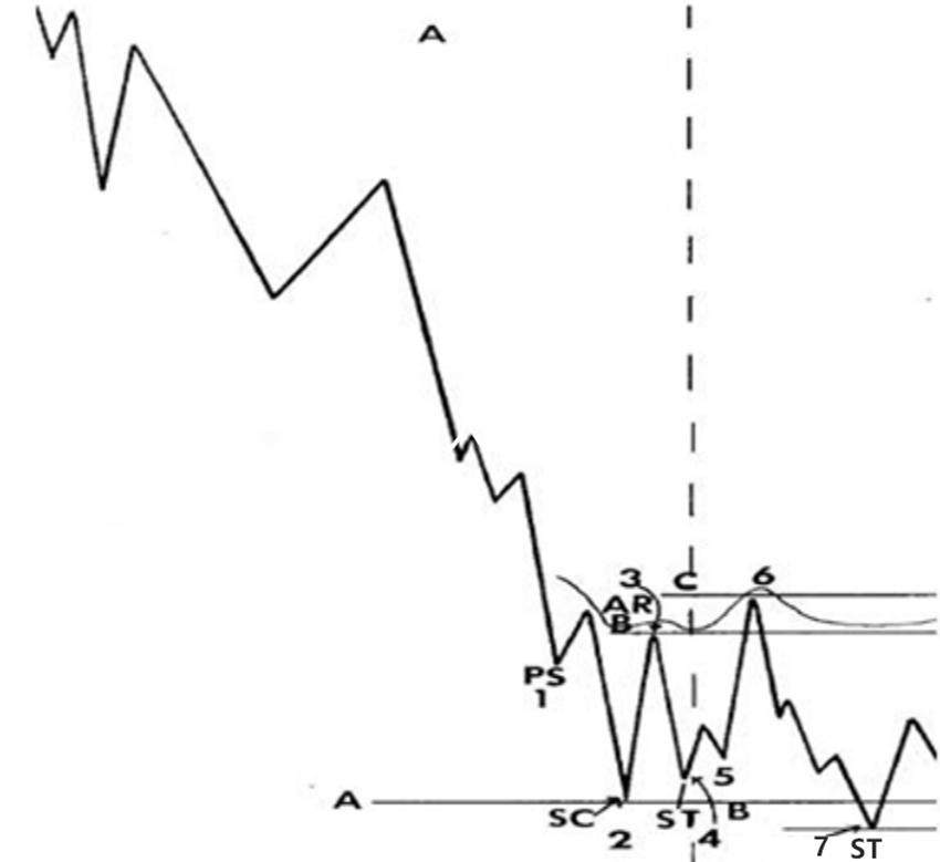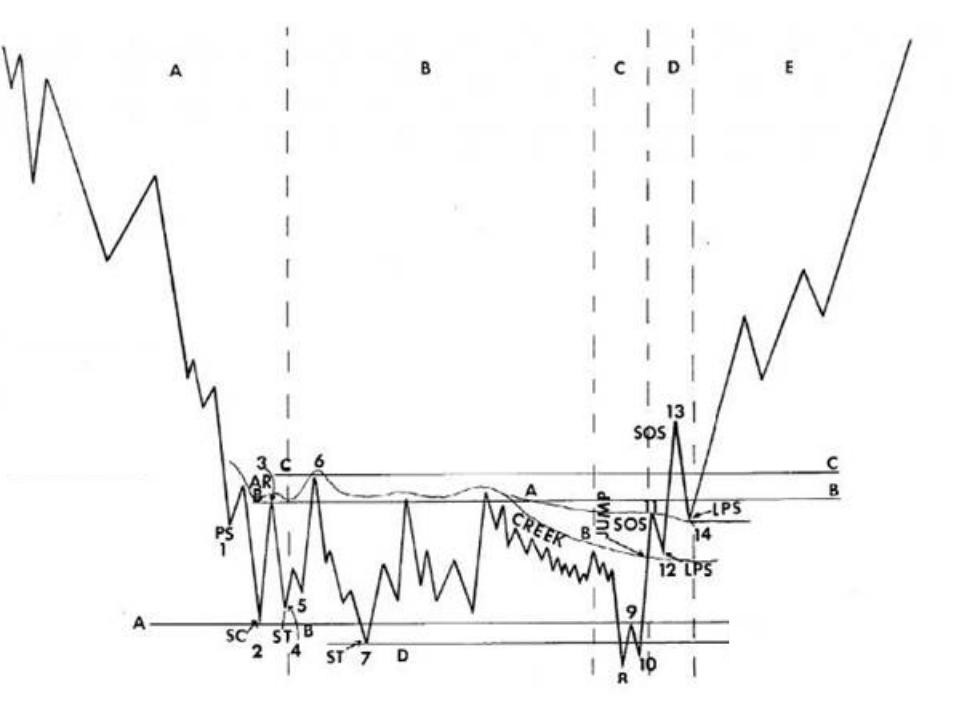 要想在3结束和4开始的时候建仓,我们必须通过吸筹路线图(图2),了解市场底部背后的参与者都在干什么,这个图帮助我们掌握吸筹的理论基础。没有这些理论基础的交易,属于公众行为。当你能够剖析眼前的价格背后的运作之后,你会发现⼀切技术指标和⼏何图形都属于表象(或者干脆放弃)。如果打算在底部买入,以下信息必须理顺: