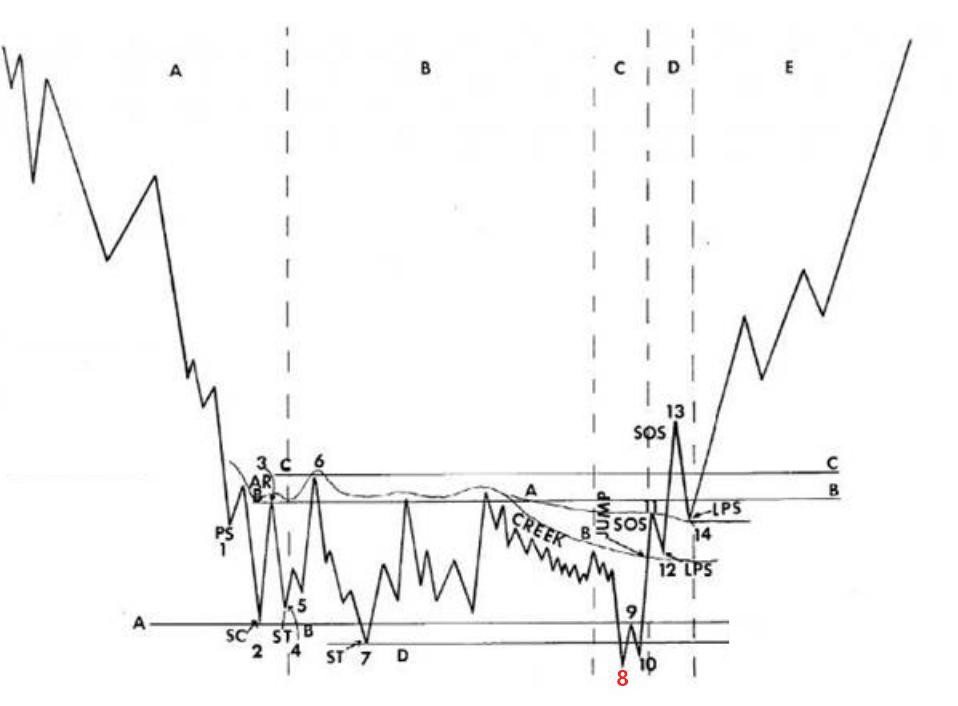 ⼀旦震仓出现,吸筹就被确认了。吸筹的确认等于给我们提供了进场方向,我们可以在震仓底部先建部分仓。确认震仓的是⾏为是快速反弹(9的位置,这个反弹不⼀定很高,但是动作必须是迅速),然后是对震仓的二次测试(10的位置)。这次测试必须是⼩成交量和⼩蜡烛,这样才能告诉我们震仓起作用了,已经把浮动供应(或者那些顽固不化死磕的公众)清除了。震仓和这次低量测试,不但确认了吸筹,而且清除了上涨障碍。