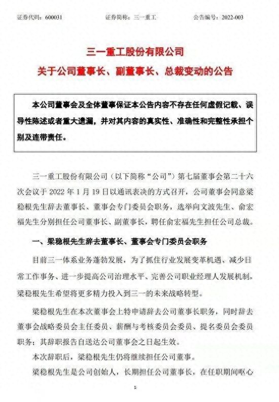 2022年,新年伊始,三一重工就发布了这样一个重磅公告,梁稳根辞去三一重工董事长、董事会专门委员会职务,选举向文波、俞宏福分别担任公司董事长、副董事长,聘任俞宏福担任公司总裁。