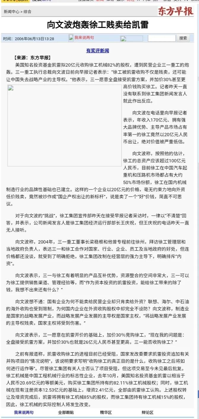 眼看收购案就要尘埃落定了,2006年6月,向文波突然在其博客发表了一篇言辞激烈的文章《三亿美元,三一能否收购徐工》,对凯雷徐工并购案提出质疑,由此揭开了炮轰徐工廉价甩卖给外资凯雷的序幕。