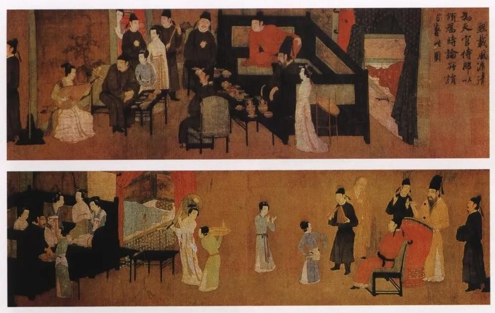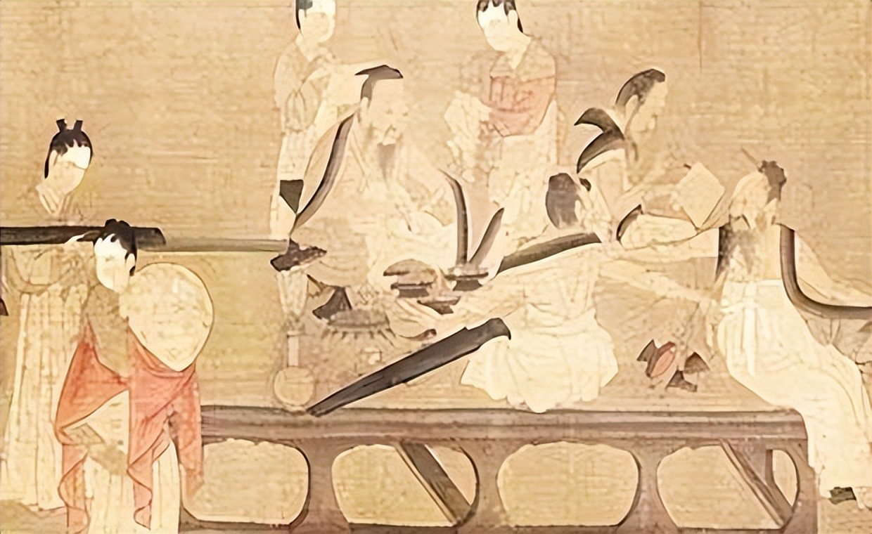 不设几案,这怎么吃饭呢?孙晟有的是办法,他使“众美貌家妓,各执一器端菜,环立宾客左右而设宴”。原来,孙晟这个物欲横流之徒不设几案并不是没有高台,而是让那些长相貌美的家妓手里捧着菜,端着酒杯,在宾客左右围立伺候。