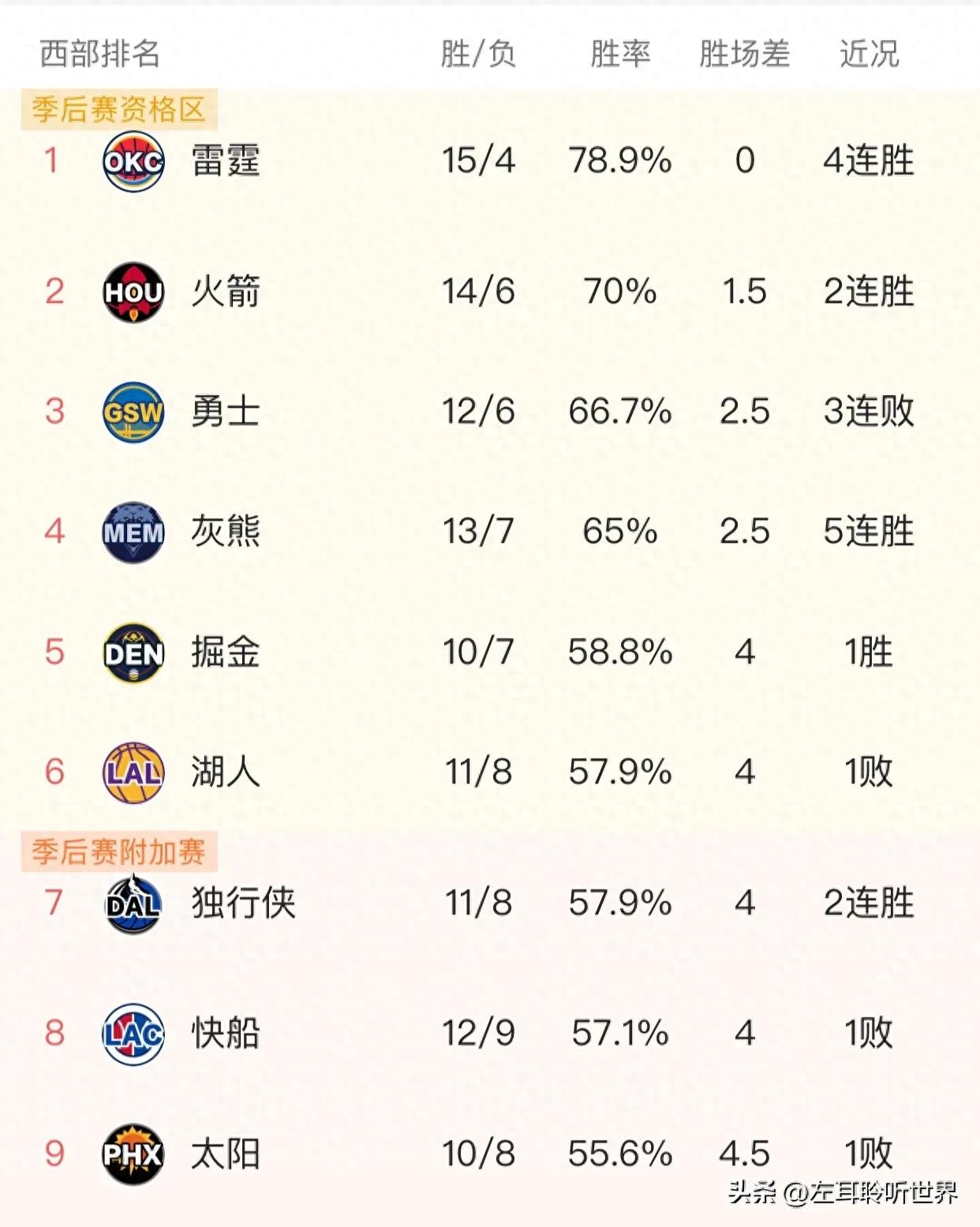 排在西部前八名的依次是,雷霆、火箭、勇士、灰熊、掘金、湖人、独行侠、快船。