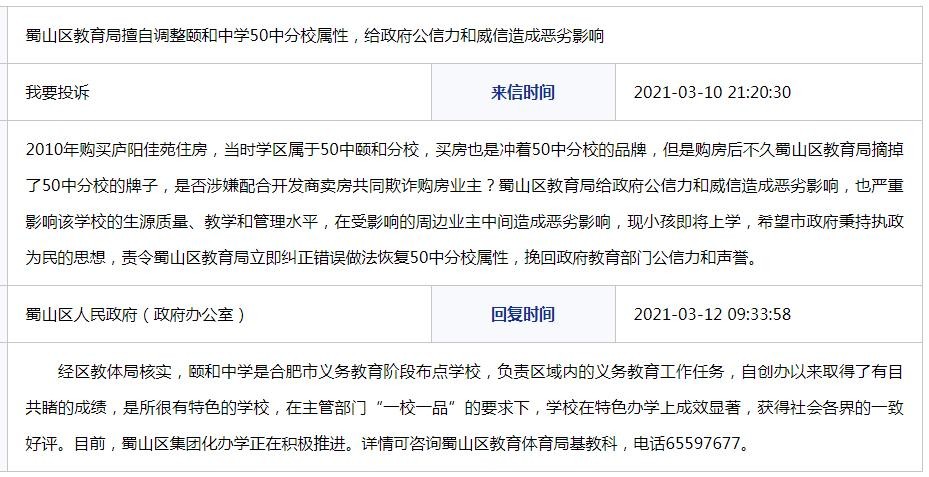 网友:2010年购买庐阳佳苑住房,当时学区属于50中颐和分校,买房也是冲着50中分校的品牌,但是购房后不久蜀山区教育局摘掉了50中分校的牌子,是否涉嫌配合开发商卖房共同欺诈购房业主?蜀山区教育局给政府公信力和威信造成恶劣影响,也严重影响该学校的生源质量、教学和管理水平,在受影响的周边业主中间造成恶劣影响,现小孩即将上学,希望市政府秉持执政为民的思想,责令蜀山区教育局立即纠正错误做法恢复50中分校属性,挽回政府教育部门公信力和声誉。