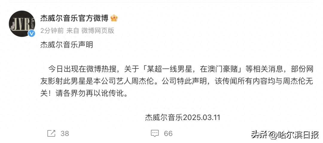 3月11日,杰威尔音乐官方微博发表声明:今日出现在微博热搜,关于“某超一线男星,在澳门豪赌”等相关消息,部分网友影射此男星是本公司艺人周杰伦。公司特此声明,该传闻所有内容均与周杰伦无关!请各界勿再以讹传讹。