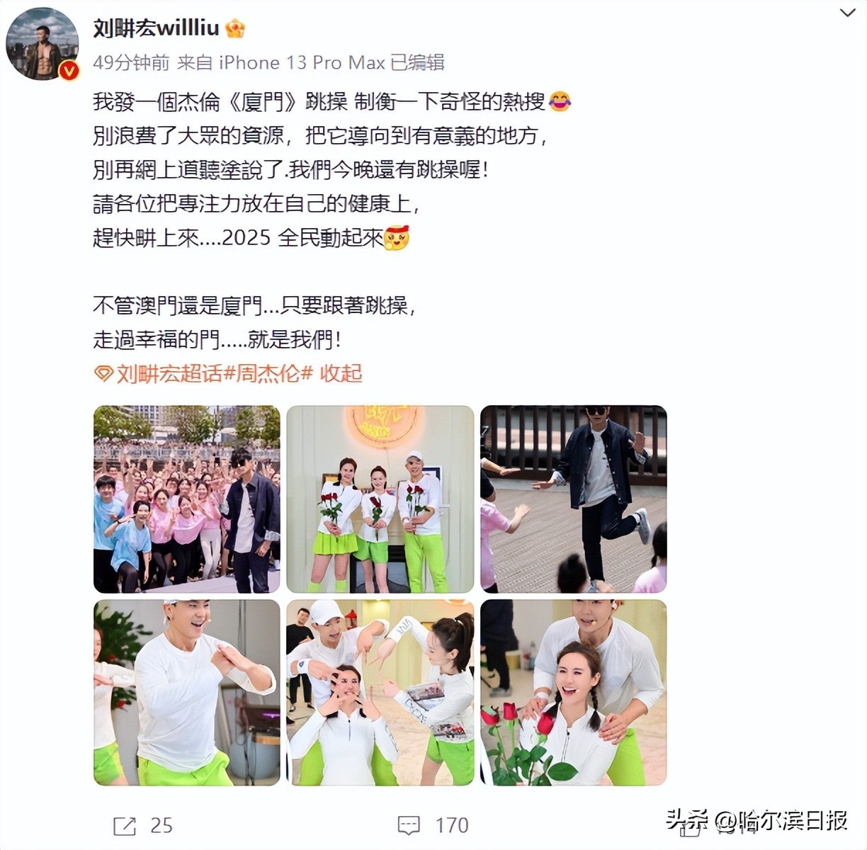 3月11日,刘畊宏晒出周杰伦在厦门跳操照片,称:“制衡一下奇怪的热搜,别在网上道听途说了。”