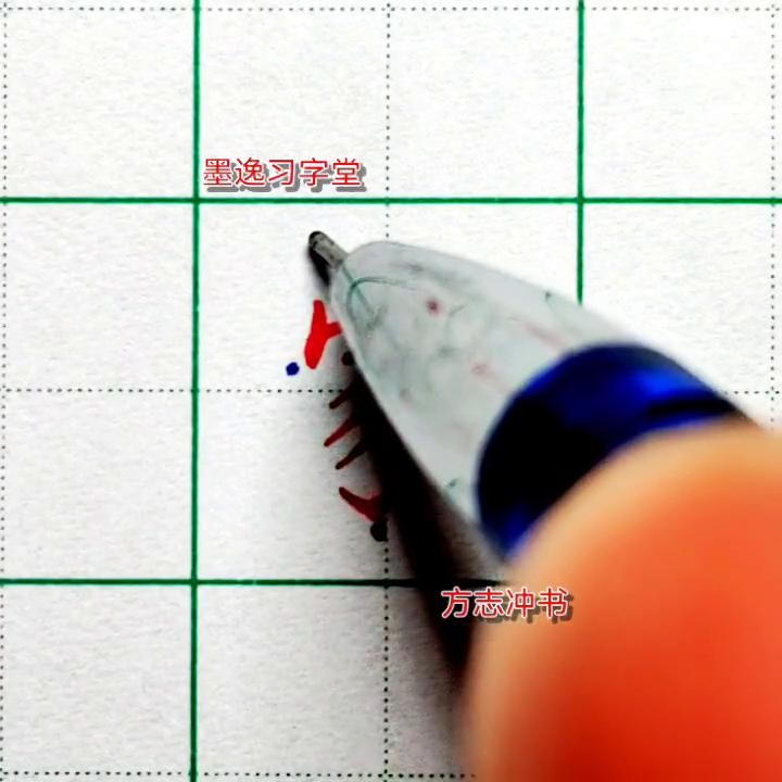 ·这个字首先说一下点,横、横、点和两个横距离相等,两个横倾斜向上,右点要小,在竖中线上,左点立起来,稍微的偏左下一点点,勾要短横,勾的勾要短,短横。