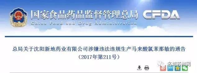 12月17日,国家食药监总局发布《总局关于沈阳新地药业有限公司涉嫌违法违规生产马来酸氯苯那敏的通告(2025年第211号)》。