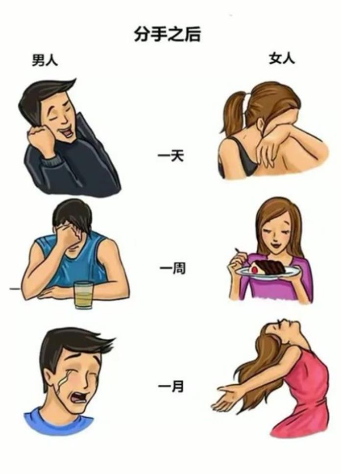 从心理学的角度来看,男人分手后的心理变化基本上分为四个阶段:享受自由——寻找新欢——孤独寂寞——想念前任。下图更形象地诠释了分手后的男女状态: