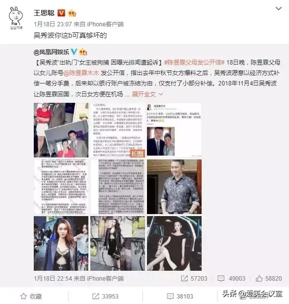 这则消息引起了有“娱乐圈纪检委”之称的王思聪王校长的关注,一夜之间连发三条微博diss吴秀波,直言:“吴秀波你这b可真够坏的。”“热搜撤得够快的,然而你这个逼还是坏得让人害怕”“陪这渣男六七年,换来监狱六七年,真**渣。”引发舆论爆点。