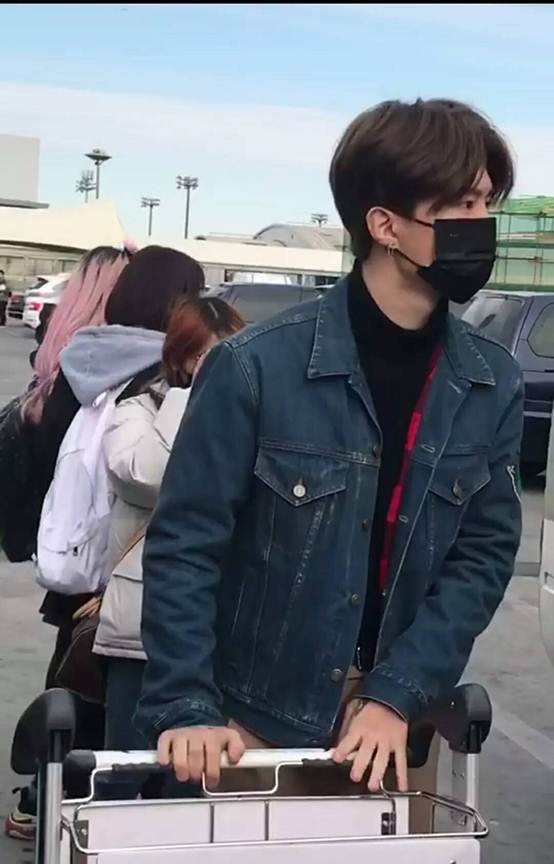范丞丞一直在韩国接受学习和训练,最近回国在机场被曝光,身蓝色牛仔搭配黑色内衬,留着一头中分长发,眼戴口罩,耳朵上还带着耳钉,穿着上十分的韩范。