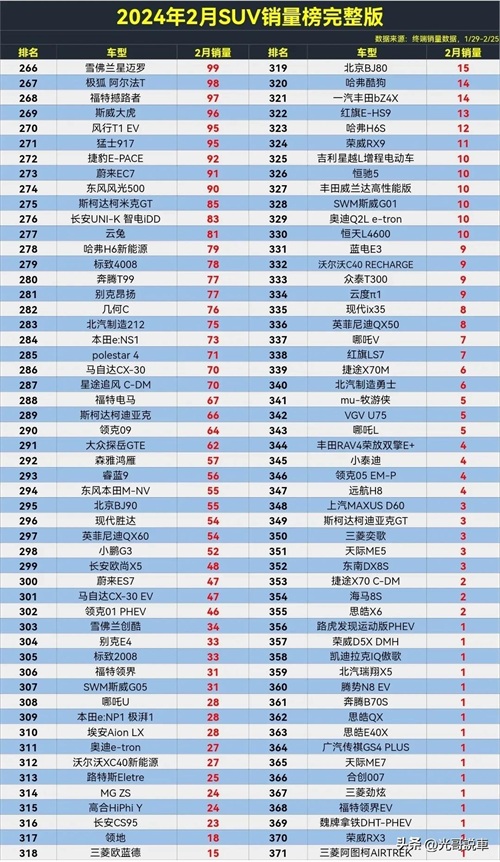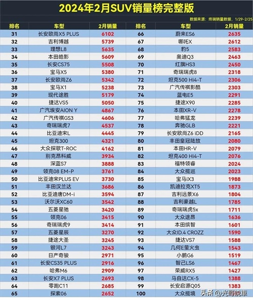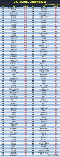 太惨了,2024年2月SUV销量榜完整版,共有106款车型不足百辆。