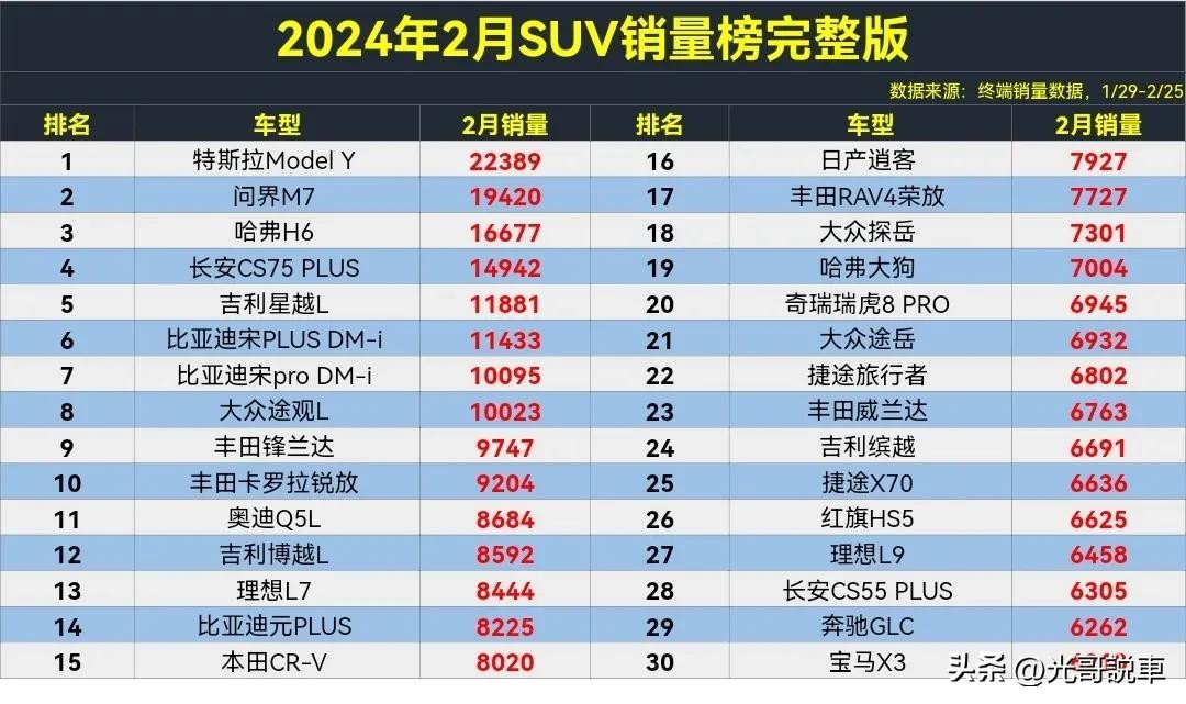具先来看看前30名,Model Y以2.2万辆夺冠,问界M7达1.9万辆,哈弗H6、长安CS75P都1.4万辆以上,星越L、宋PLUS DM-i、宋Pro DM-i、途观L都超万辆大关,表现都很不错,本田CR-V 8020辆,途岳、捷途旅行者、红旗HS5、理想L9都6千辆以上。