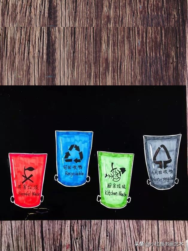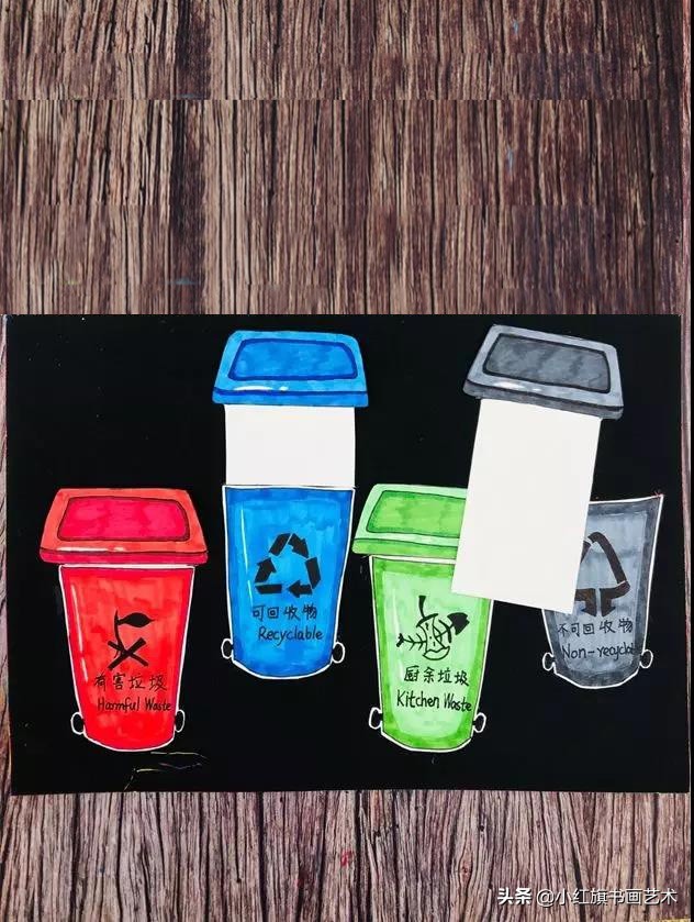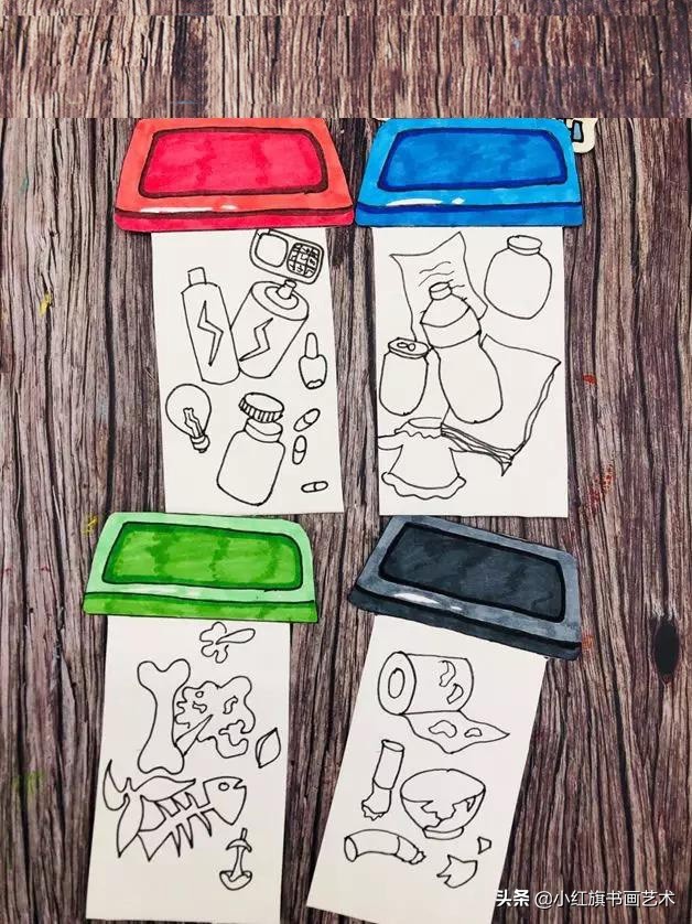 第一步:在白卡上画出不同颜色的垃圾桶。