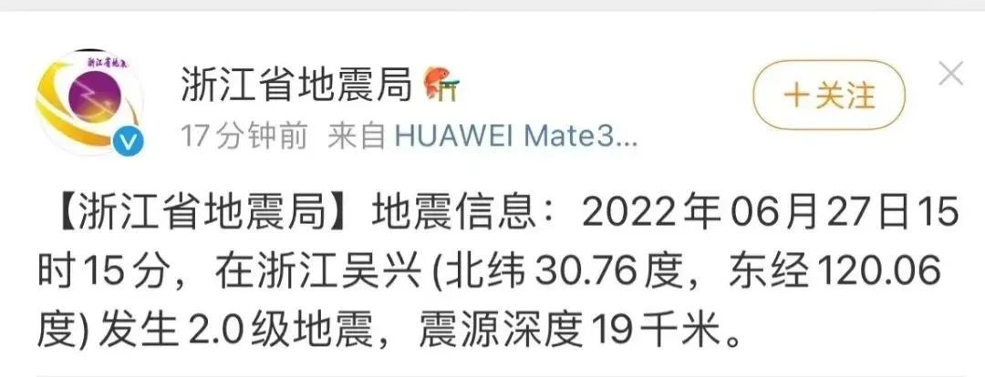 刚刚,浙江省地震局发布微博称,2022年06月27日15时15分,在浙江吴兴(北纬30.76度,东经120.06度)发生2.0级地震,震源深度19千米。