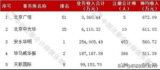 2022年度,注册会计师人均业务收入最高的为北京广恒,注册会计师人均收入达到672.09万元。北京中光华、安永华明、毕马威华振、天职国际的注册会计师平均收入均超500万元。