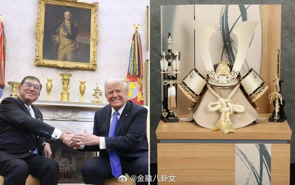 石破茂赠送了川普一个黄金的武士头盔!这顶金光闪闪的武士头盔出自于石破茂首相的家乡鸟取县的一间手作工坊,据店家表示,去年11月就收到外交部的订单,当时他们提出两个要求:必需是真的可以戴的头盔;使用的黄金越多越好[doge]