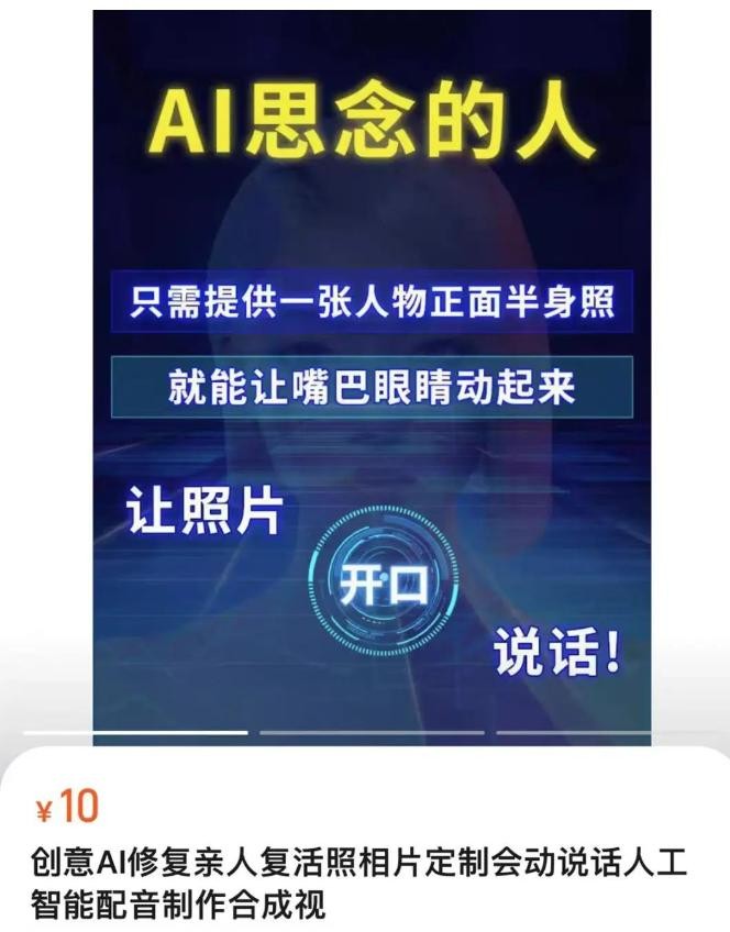 普通人有机会让已故的亲人“复活”吗?记者在电商平台上看到,有不少店铺提供用AI技术“复活”已故亲人的服务,价格在10元至数百元不等,有的还提供定制服务。