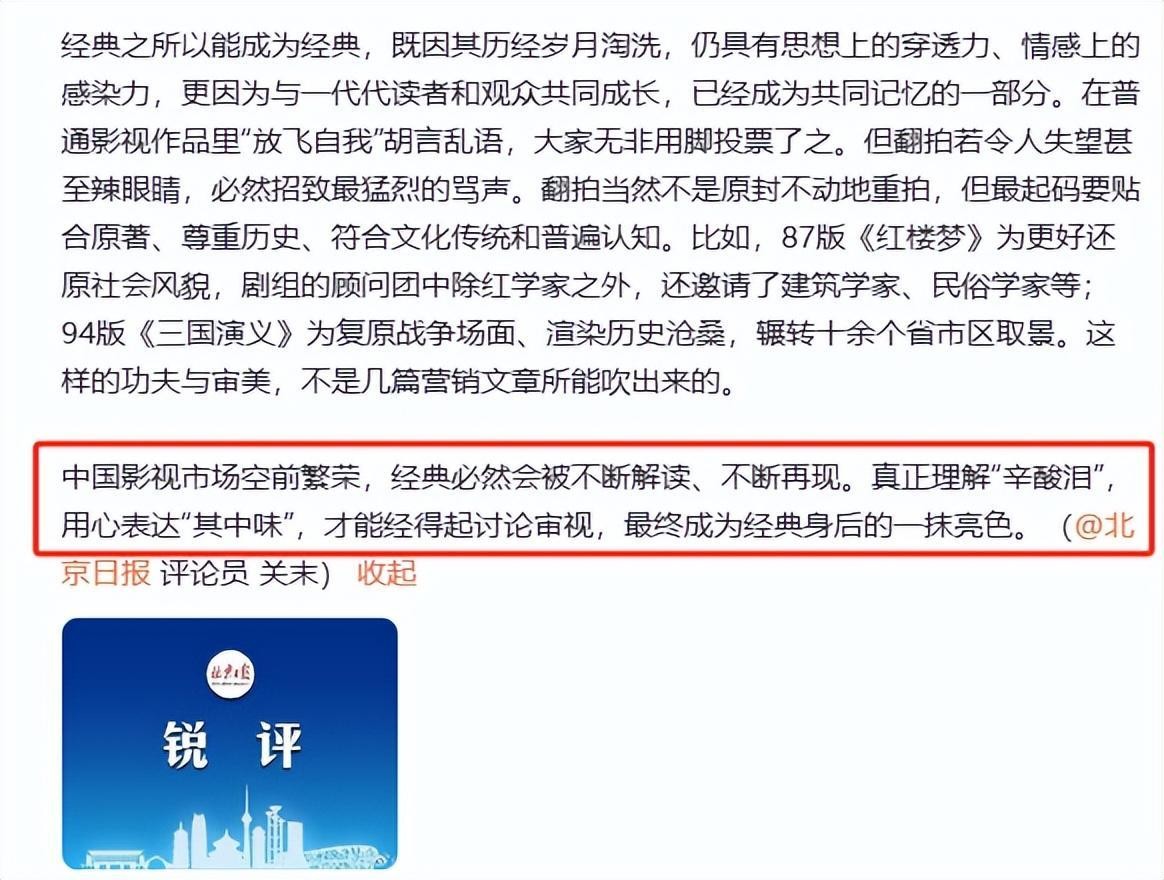 但如今我们有了更先进的技术怎么拍摄出来的作品还不如几十年前的呢?难道翻拍就一定“翻车”?还是说我们的眼光更加挑剔了呢?或许在北京日报的点评和陈晓旭的话中我们能找到答案。