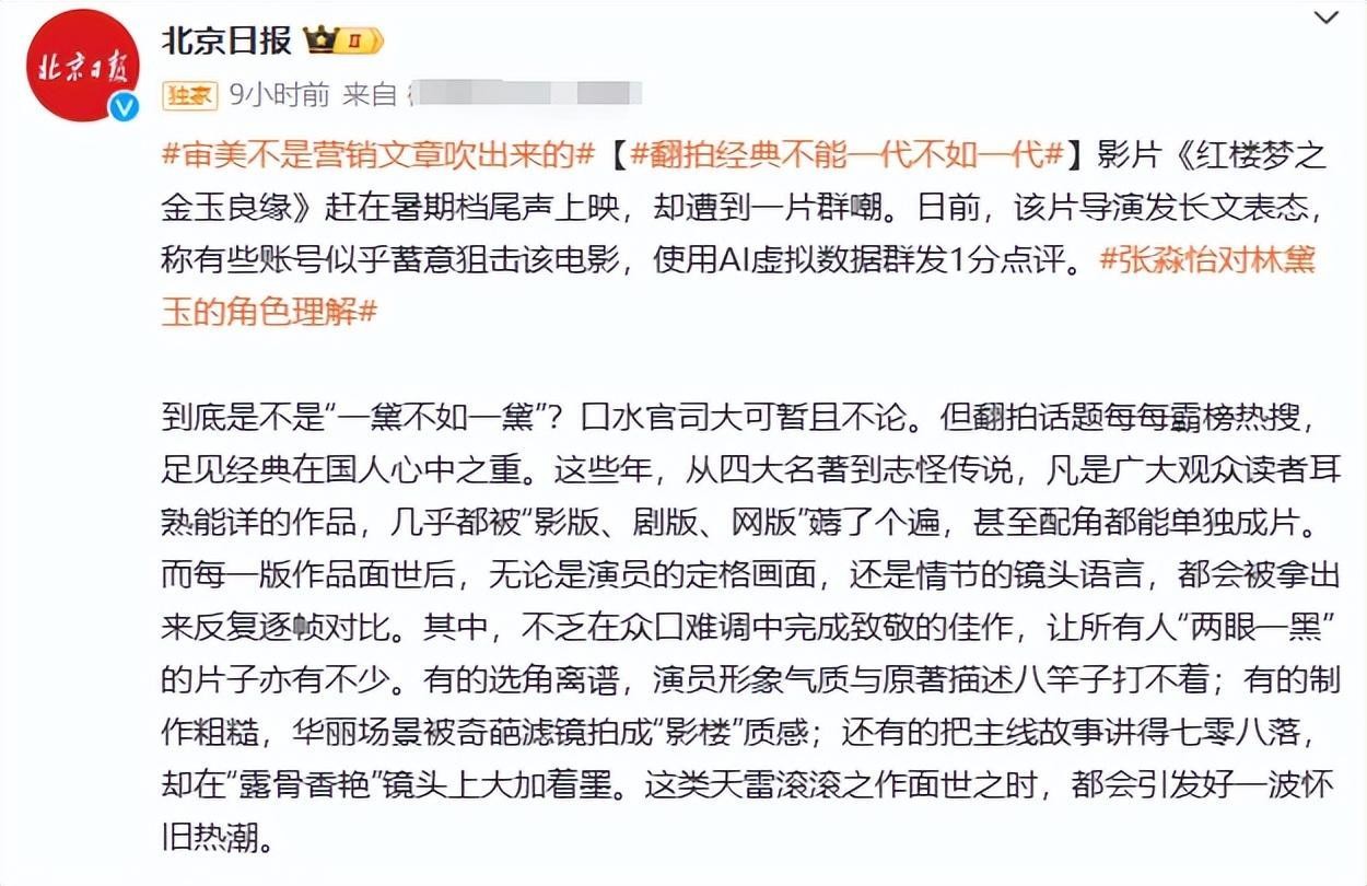 胡玫导演的电影《红楼梦》差评如潮,观众甚至说“想过它烂,没想过它这么烂啊。”