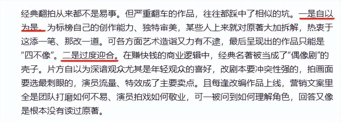 她认为,真正的经典改编应该尊重原著的精神内核,而不是一味地迎合现代观众的口味。