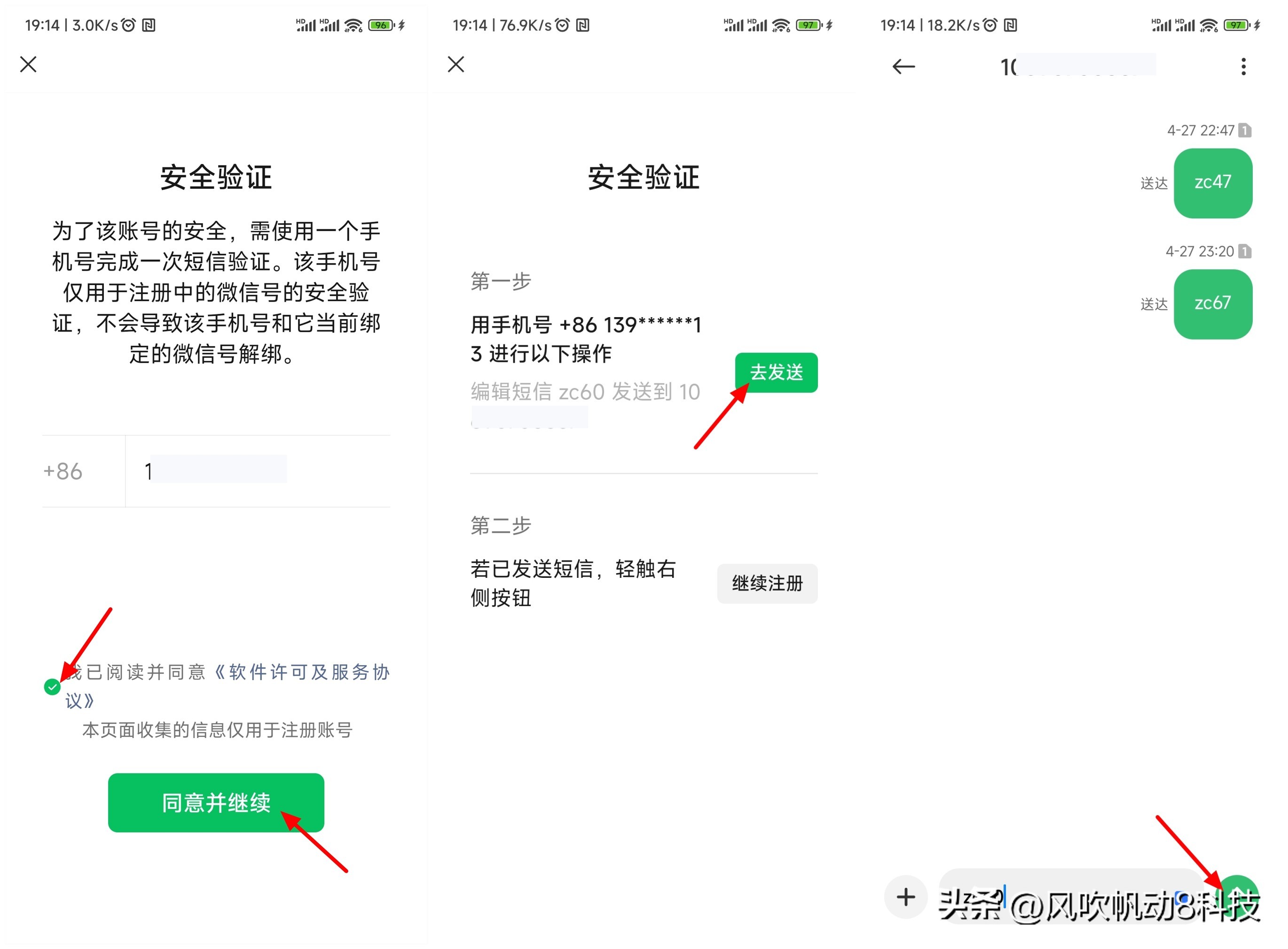 进入后,勾选【软件许可及服务协议】,轻点【同意并继续】。接着选择轻点【去发送】,紧接着轻点【确定】。在新信息界面中,轻点【发送】。